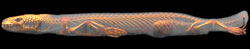Heloderma suspectum is a large (maximum total length to about 56 cm), stout lizard with a large head and powerful jaws, short limbs with large toes and strong claws, and a robust tail used to store fat. The dorsal skin appears as bumps or beads underlain by bony osteoderms (see the animations above); the ventral belly scales are rectangular. Coloration is a striking pairing of black with pink, orange, yellow, or cream. The mottled pattern can provide camouflage in the broken shadows of desert vegetation, but the bright colors may also work as aposematic warning to potential predators of the venom contained in glands in the lower jaw of the Gila Monster. In contrast to helodermatids, venom in snakes is in glands in the upper jaw and often delivered via hollow fangs. In Heloderma the venom is delivered more slowly through grooves in teeth of the lower jaw during an often prolonged, even chewing bite. The venom has been described as excruciatingly painful, but rarely if ever fatal, to humans. A peptide found in the venom has become a promising new drug for treating type-2 diabetes.
